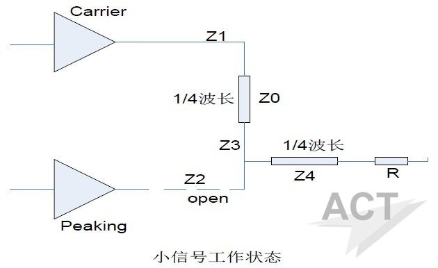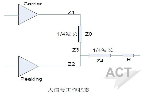 在小信号工作阶段,载波放大器正常工作,峰值放大器关断未工作。 此时峰值放大器相当于开路状态,阻抗Z2无穷大,避免了载波放大器的功率泄露。载波功放后的1/4波长传输线起阻抗变换作用,即Z0*Z0=Z1*Z3,Z4*Z4=R*Z3。当Z0=R=50欧且Z4=0.707R时,Z3=25欧,Z1=2Z0=100欧。 在大信号工作阶段,峰值放大器开启工作,可以看成是载波功放的有源负载。