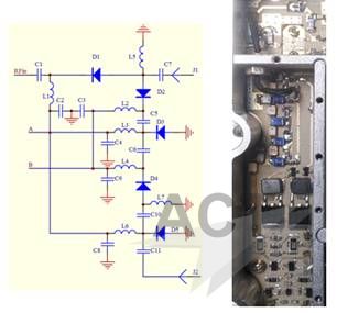 图 7 . 谐波滤波器 3.4 高功率TR开关高功率收发开关由收发开关射频电路,高压电源和开关驱动器构成【2】,用于切换发射和接收通道。在发射时要确保有足够的收发隔离,保护接收机不被发射功率烧毁;在接收时,确保有低插损,降低接收噪声。高压电源为开关管提供足够的反向偏压,防止发射时的射频高功率使接收支路的开关管导通。驱动电路将TTL开关控制信号转换为一定驱动功率,快速转换开关管的工作状态,达到切换收发通道的目的。 3.4.1 高功率TR开关使用功率PIN二极管做开关器件,控制射频高功率。TR开关的原理图见图8。发射支路采用一只串联管,降低插损,接收支路使用串、并联四管电路,提高收发隔离度,同时确保较低的插损。