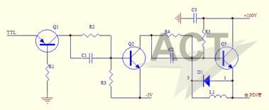 图 11 . 单路开关驱动器 图11是单路开关驱动器原理图,当TTL控制信号为高电平时,驱动器输出-5V正向偏压,开关PIN管导通;当TTL信号为低电平时,驱动器输出+100V反向偏压,开关PIN管截止。 TR开关用两路驱动信号,一路A另一路B,互为反向。用一路TTL信号,经反向器(非门)分别控制两路驱动器,从而控制收发开关工作。图12是两路驱动器输出端的开关驱动信号波形。