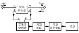 图 3 . 放大链电原理图 第一级是MMIC放大器芯片,无需设计匹配电路。第二级和第三级选择非匹配FET管,需要设计输入输出和级间匹配电路,以达到功率预算设置的技术指标。 使用设计软件,对放大器电路进行仿真优化,以及改进调整,再仿真优化,最终得到电路拓扑,见图3。 3.2 功率监测与反射监测电路设计电路配置见图4。在功率放大器输出端接耦合度为-30dB的定向耦合器,耦合端4提取一部分功放输出功率Pin,耦合端3提取来自输出端的反射功率Pr。提取的功率经衰减后进入双通道功率检测器。