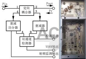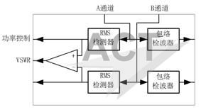 图5 . 双通道功率检测器 幅度调整到达双通道检测器的B通道,经RMS检测器到达差分放大器的反相端IN-。定向耦合器要有足够的隔离度,确保在4端口的输出功率取样与在3端口的反射功率取样各自独立。由于RMS检测器的输出电压与功放输出功率(dBm)成线性关系,检测器内的差分放大器将A通道电压Uo和B通道电压Ur做差分放大,输出电压: U = k (Ur-Uo) 由于两RMS检测器输出电压与功放输出功率的对数关系,该输出电压就是反射系数Γ,通过反射系数与电压驻波比VSWR的关系: