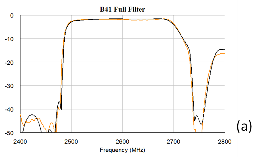 图4:全频段41滤波器的平坦通带响应,典型损耗2.1dB,典型Wi-Fi抑制43dB,最高可达通道11:仿真——黑色,测量——橙色
