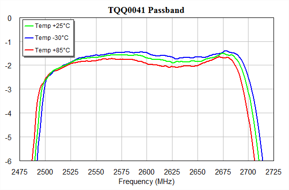 以下部分将总结全频段41滤波器的性能。图5显示典型通带抑制行为随温度的变化,如预期一样,对于低温运行,临界点在频段下沿的2496MHz处。零件经过优化可在194MHz全频段实现-3.5dB的最大插入损耗等级。但是,频段中部的典型损耗等级明显降低,典型等级仅为-2.1dB,如图5所示。