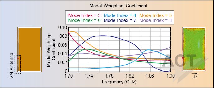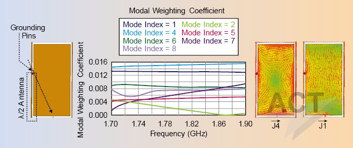 图1、CMA设计的典型工作流程 第一步:对结构进行理解 第一步涉及到对结构行为理解的初步研究。在这一步中,我们可以使用一个简单并具有代表性的结构,可以不包含激励和天线结构。CMA分析将确定哪一些模式在感兴趣的频段内是自然而然的谐振或者接近谐振的,以及单一模式或模式组合的属性是否适用于我们当前的应用。 第二步:激励起正确的模式 一旦选择好一个模式或者一个模式组合,那和这些模式有关的激励也必须进行设计。结构和天线的详细CMA分析可以如下进行:选择合适的天线类型和位置、天线馈源的类型和位置,在多天线系统中,还需同时考虑激励的幅度和相位。通过对模式加权系数分析和评估,可以确定我们的设计是如何实现已选择的模式的。 第三步:验证设计 最后一步是验证阶段,在该步骤中,我们可以使用不同的求解器计算性能参数,例如S参数、增益等等。 接下来将通过一个实用的设计案例演示如何使用以上设计步骤。 智能手机天线设计 在这个例子中,我们应用CMA技术[2]设计一个用于70mm*130mm PCB板的智能手机天线。天线工作在DCS1800频段,该频段和较低的GSM900频段相比具有更多的谐振模式[3],并且可以直接集成到设备的外部金属框架中。我们研究了几种设计情形,这里展示了其中的三个情形用来强调CMA是如何被运用的具体方面。 在这个例子中,我们使用了一个单一天线单元,这使得激励和控制模式变得更具挑战性[4]。为了控制模式的行为而不额外增加天线单元,在设计中我们使用了一个接地连接器、槽缝和无源谐振器的组合。 值得注意的是,在这些设计中我们没有使用自动优化功能。所有的结果都是通过对CMA结果进行解释而得到,并在必要的时候,采用进一步的设计迭代来调整性能。CMA的强大之处就在这里:通过深入理解,从而做出更具信息量的设计决定。 对结构的理解。一个对PCB板和边框的初步的CMA分析在我们感兴趣的频段范围(1.7-1.9GHz)内进行,从而对谐振模式和相关的模式电流分布进行评估(图2)。模式1和模式2采用沿着PCB板和边框长度或宽度流动的模式电流来展示类偶极子特性,然而模式3到模式5有更加复杂的模式电流分布。