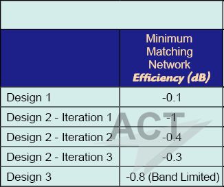 图7、带无源谐振腔的窄带设计 接下来的一节展示了模式的加权系数和实际带宽是如何相关的,这是一个非常有用的概念。带宽性能得以在阻抗匹配之前进行估计,阻抗匹配可在之后的步骤中进行考虑,可通过严格的优化或者加入一个匹配电路实现。 对比设计 作为一个比较的方法,我们使用了Optenni Lab [5]工具对每一个设计都生成了匹配电路,并对每一个设计都仿真了S参数和辐射方向图性能。由于设计3的带宽限制,设计了一个带宽限制在1.785GHz到1.815GHz的匹配电路来确保在中心频点的比较。其它设计都在整个频段内进行匹配。表1显示了基于Optenni Lab工具进行设计的匹配网络的效率的比较。图8和图9显示了不同设计的S11、总辐射功率和辐射方向图。