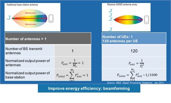 利用波束赋形提高能量效率在传统蜂窝网络中,与小区相关联的基站会向着相当广泛的区域传输能量(通常是基站前方120度角的弧形区域)。其中一部分能量会被基站小区内的用户接收,但绝大多数能量则被环境所吸收(建筑、行人、树木、汽车等)。这些耗损就意味着能量效率的降低和网络OPEX的提高(图5)。如果将单根基站天线替换为由120根天线向各个用户定向传输能量,那么基站所需的功耗将降低至原输出功率的0.1%(参考文献3)。然而这个下降幅度仅仅是理论值,从实际角度而言,由于基站内部射频元件的效能和损耗,相同容量下的输出功率只能降低到原功率的30%。