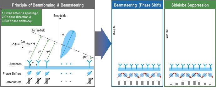 为了实现波束赋形,一组指定间隔的天线只需改变天线间的相位差,就可以形成任意方向的波束(图6)。最典型的天线阵列间隔是半波长,这样波束角(
