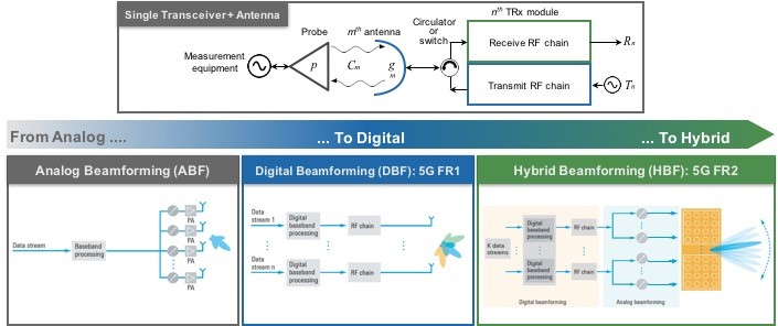 图6:波束赋形的原理 波束赋形有三种架构,会直接影响到基站能量效率和终端(图7): ● 模拟波束赋形(ABF):传统的波束赋形方式是使用衰减器和移相器作为模拟射频电路的一部分,其中单个数据流会分成不同的路径。这种方法的优势在于只需要一个射频链路(PA、LNA、滤波器、开关/环形器),而劣势则是级联移相器在高功率下会产生损耗。 ● 数字波束赋形(DBF):数字波束赋形假设每个天线单元都有一个单独的射频链路。随后以矩阵式操作为波束“赋形”,即在基带中手动为振幅和相位加权。由于射频链路组件的价格较为低廉,且可以将MIMO和波束赋形结合成单个阵列,对于5G FR1中7GHz以下的频率,这一方法往往是最佳选择。对于28GHz及以上频率,标准CMOS组件的PA和ADC非常容易损耗,而如果采用砷化镓和硝酸镓等稀有材料,虽然损耗会有所减少,但成本高昂。 ● 混合波束赋形(HBF):混合波束赋形将数字波束赋形与模拟波束赋形相结合,保证了波束赋形与多台无线电收发的灵活性,同时降低了波束赋形单元(BFU)的支出和损耗。每个数据流都有各自独立的模拟BFU和一组M天线。如果有N个数据流,就有NxM根天线。由于使用可选波束赋形器(如Butler矩阵)来代替自适应移相器,从而可以缓解移相器造成的模拟BFU损耗。建议的架构是使用数字BFU控制主波束的方向,而模拟BFU控制数字包络内的波束。
