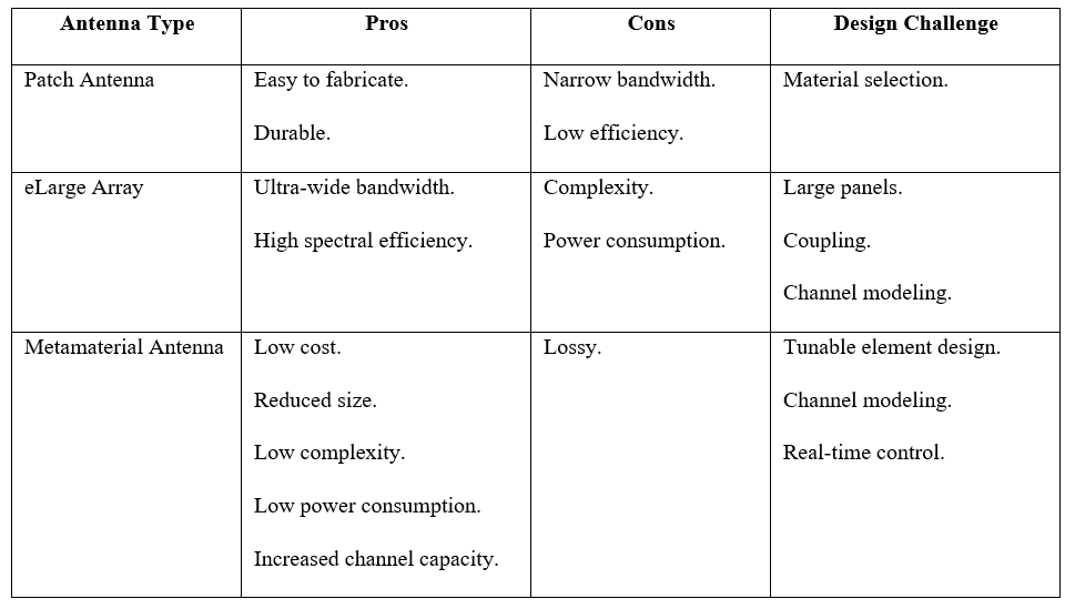 图10:用于6G的光子控制超表面天线。50 Ghzaoui等人48提出了一种高增益圆极化天线,该天线采用μ负MM板,折射率接近零。为了实现高增益和圆极化,该天线采用了基底集成波导(SIW)方法,装载了一个紧凑的方形分裂环谐振器,并以六边形结构作为unit cell。该天线在100-280GHz的宽频率范围内进行了仿真,在223GHz时记录到11.3dBi的峰值增益。虽然实现了高增益和良好的交叉极化,但该天线无法重新配置。 为了提高线性馈电天线阵列发射的许多波束的增益,同时考虑到多层传输,Lee和Kim52开发了一种大孔径超材料透镜天线(MLA)。该天线由28×28个单元组成,由一个1.6dBi的偶极子天线馈电。MLA在共振频率为28GHz时可获得14dBi增益。获得高增益的原因是他们提出了一个新颖的信道模型,该模型考虑了辐射方向图、方位辐射方向图和超材料馈电(meta feed)。 贴片天线、大型阵列和超材料天线的比较见表4。 表4:用于6G和未来通信的贴片天线、大型阵列和超材料天线的比较