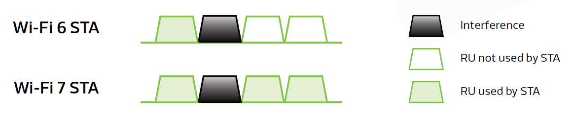 图3. 搭载MLO技术的Wi-Fi 7 与 Wi-Fi 6的对比(图片来源:MediaTek) MRU (Multiple Resource Unit,多资源单元) Wi-Fi 7在基于正交频分多址(OFDMA)的资源单元(RU)基础上,提出了多资源单元 (MRU) 的概念。与Wi-Fi 6中的RU分配方式相比,Wi-Fi 7所提出的MRU具有显著的不同。在Wi-Fi 6中,一个节点只能被分配一个RU,而且不能跨RU进行分配。而在Wi-Fi 7中,一个节点可以被允许分配到多个RU,从而实现了更灵活的资源分配方式。 MRU 的另一个优势在于,它能够降低干扰对可用频道的影响,并进一步提升OFDMA的效率。前导码打孔(Preamble Puncturing)技术在Wi-Fi 6中已被引入,而在Wi-Fi 7 中,该技术结合MRU的特性,使其工作机制变得更加灵活。在Wi-Fi 6的架构下,执行前导码打孔后,其RU仍需通过OFDMA机制分配给“多个”用户,这意味着在单一用户的使用场景下,前导码打孔无法发挥其优势。然而通过MRU,执行前导码打孔后的RU可以全部分配给一个用户,并且即使在不连续的频谱 (non-continuous spectrum) 环境下,也能够执行前导码打孔操作。 图4 展示了Wi-Fi 7中MRU的显著效果,其能让RU将信号干扰所导致的可用频道损耗从75%降低至25%。正因如此,相较于Wi-Fi 6站点(Station),支持MRU功能的Wi-Fi 7 站点(Station)在多用户与高密度网络环境下,能够将信道带宽的可用性提升3倍之多。此外,MRU功能不仅提高了带宽的可用性,还支持Wi-Fi 7 AP在多用户同时传输的场景下显著降低延迟。